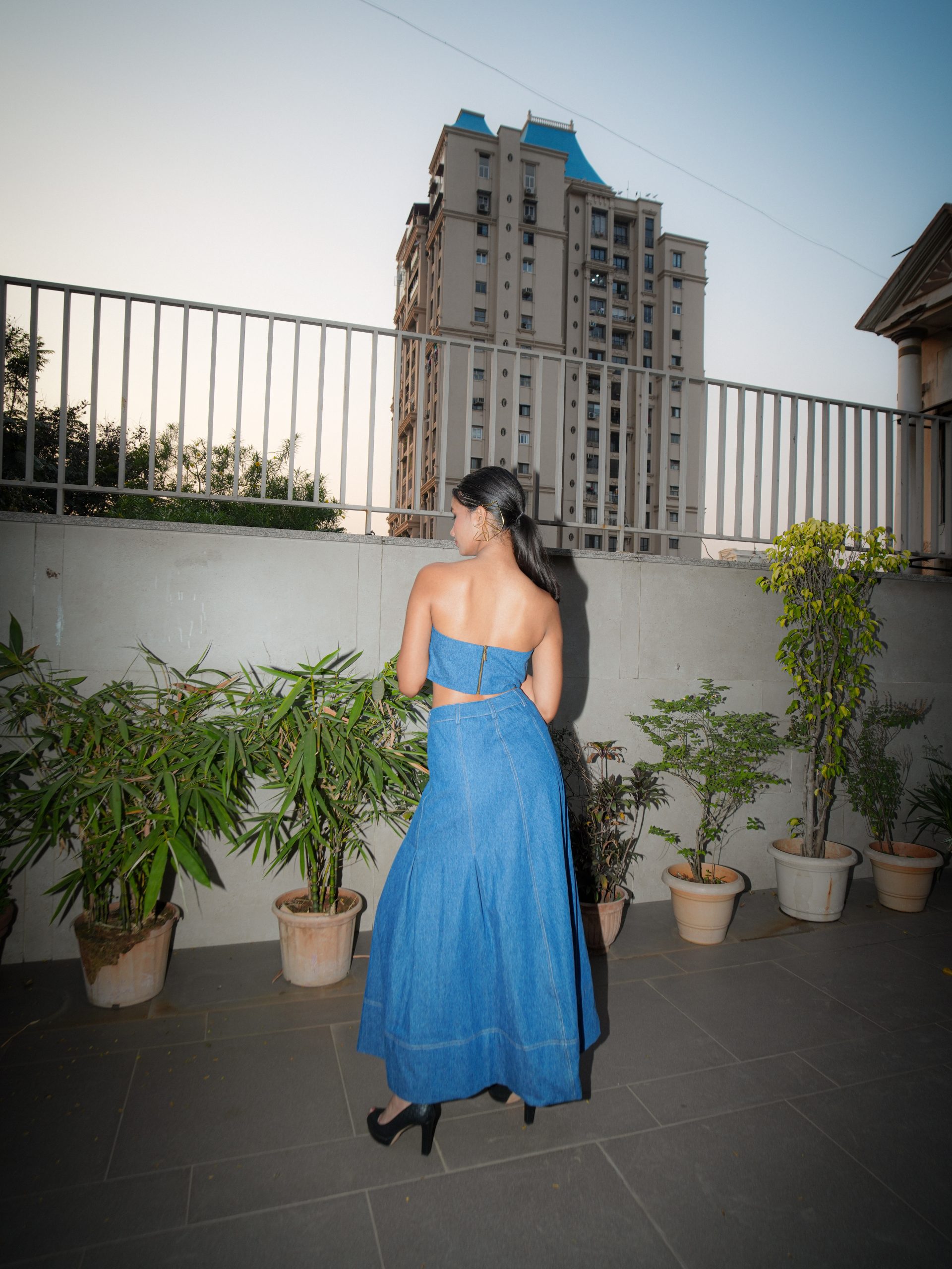 A structured denim corset top elevated with delicate frill detailing for added dimension. The sculpted silhouette enhances the waist while the soft frills introduce playful movement. A statement piece that blends edgy denim with feminine flair.